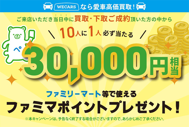 ファミマポイント30,000円相当が当たる!WECARS「車の買取ご成約キャンペーン」のお知らせ