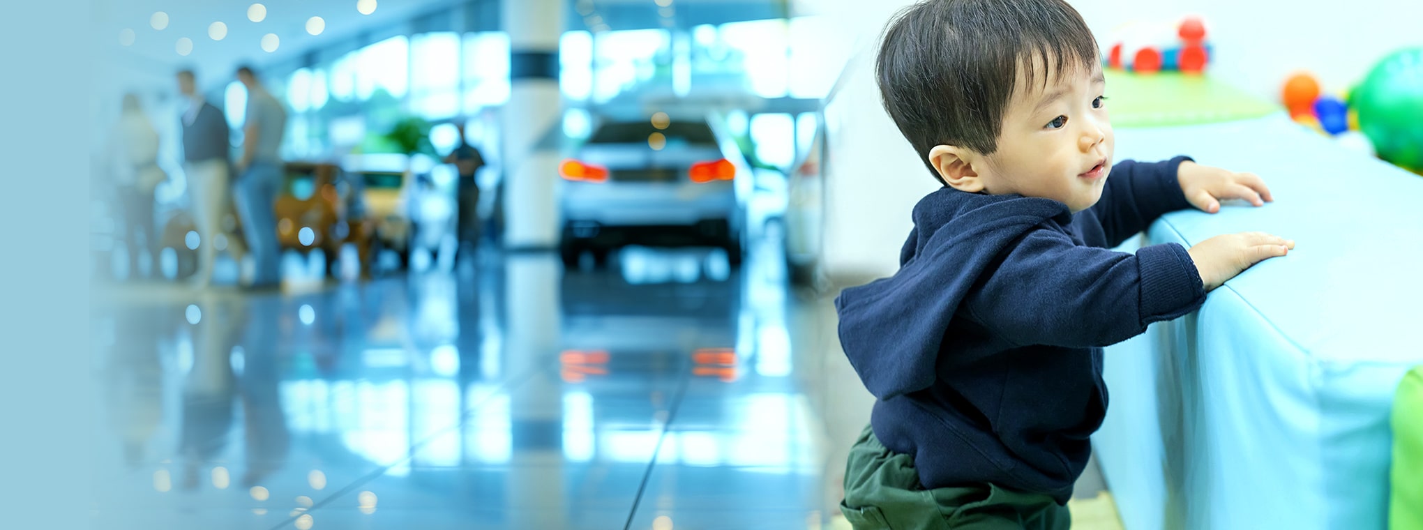 お子さまがいても気兼ねなくクルマを選べるよう、楽しく遊べる遊具や絵本等をご用意※。特製ポップコーンやジュース、お菓子も取り揃え、家族みんなが笑顔になれるクルマ屋さんを目指しています。