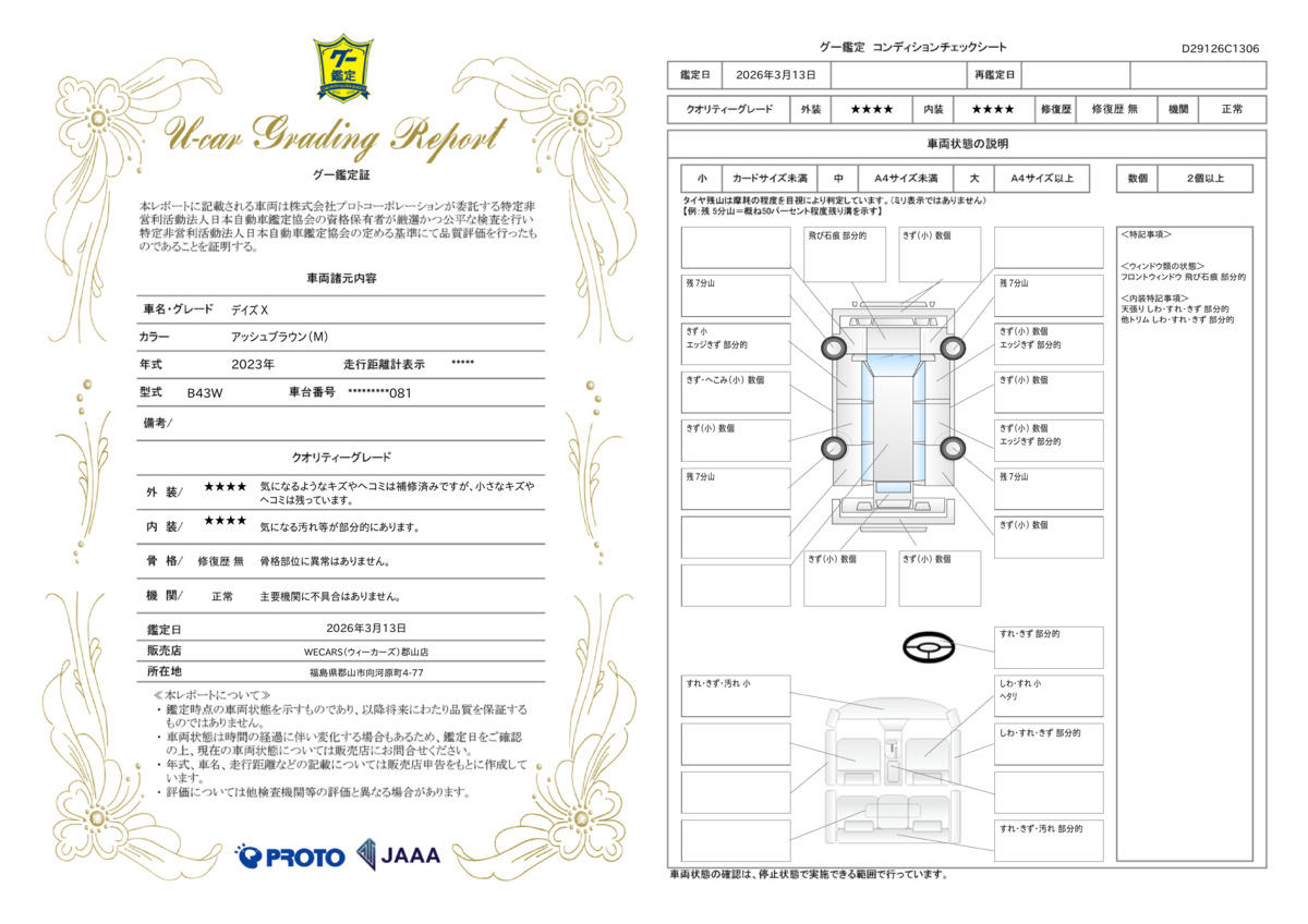 車両状態評価書鑑定書付き